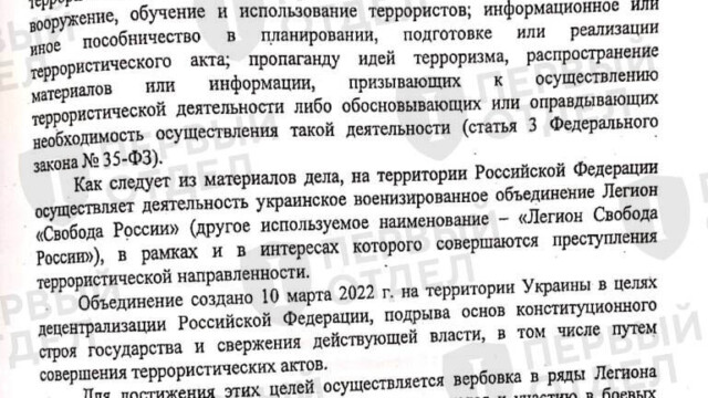 Суд утверждает, что «Легион “Свобода России”» был создан в Украине 10 марта 2022 года. Однако в этом же документе сообщается, что «Легион» был причастен к поджогам российских военкоматов в период с 28 февраля (то есть за десять дней до своего предполагаемого основания) по 22 мая 2022 года.